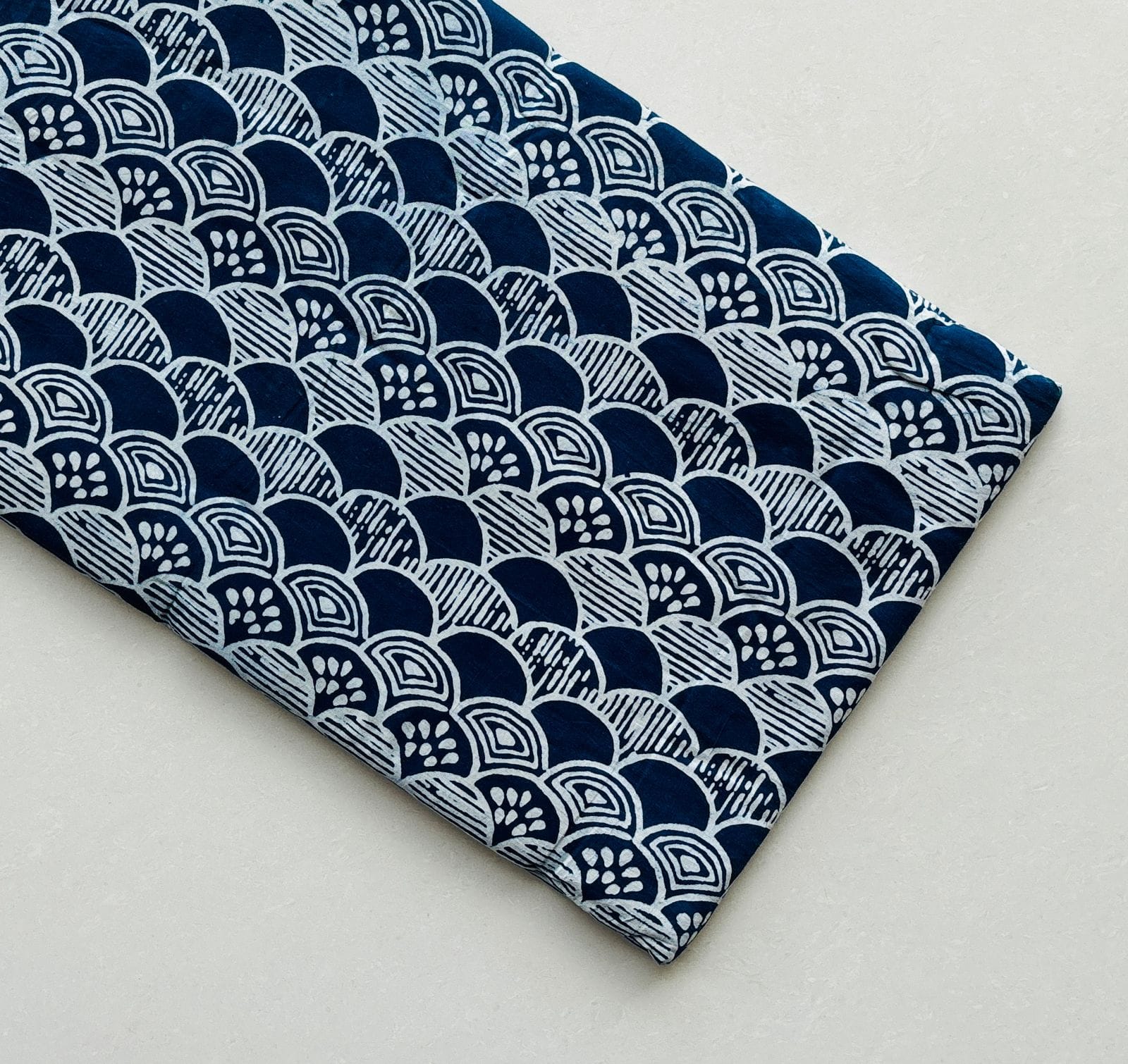 Sometimes, the search for the ideal fabric can lead you to unexpected treasures. This navy cotton fabric, adorned with an intricate scalloped design, invites you to explore its refined textures and captivating patterns. Each scallop, meticulously crafted through the traditional Dabu block printing technique, showcases alternating styles that create a rhythmic visual dance.