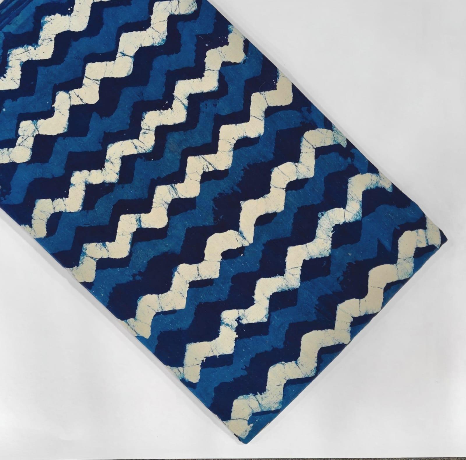 Rooted in the vibrant heritage of Indian craftsmanship, our Navy Zigzag Dance Cotton Running Fabric brings a contemporary twist to traditional block printing. The deep navy blue serves as a canvas, enriched by a rhythmic zigzag pattern in an off-white tone, reminiscent of gentle waves lapping against the shore. Each zigzag boasts a unique character, embodying the artisanal touch that defines our textiles.