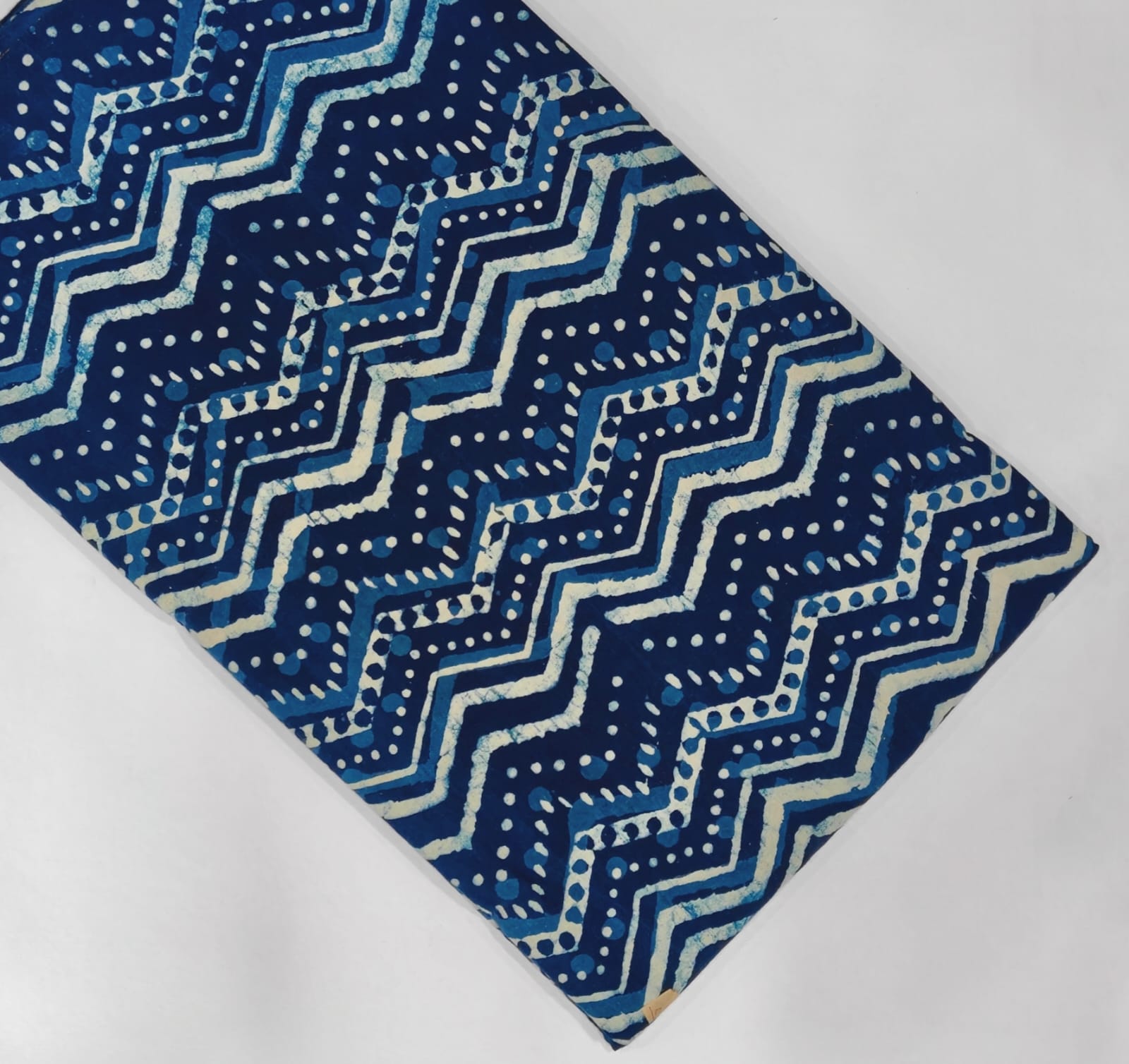Crafted in the heart of India, our Navy Zigzag Delight Dabu Cotton Running Fabric showcases a mesmerizing interplay of deep navy and lighter hues. The bold zigzag patterns, punctuated with playful polka dots, create a dynamic visual appeal that speaks to both tradition and modernity. Each piece is a testament to the meticulous craftsmanship of Bagru artisans, ensuring every inch tells a story.