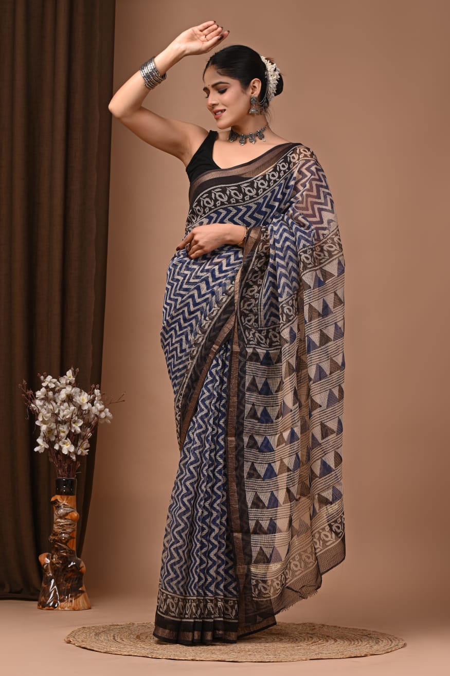 Care for this exquisite creation is straightforward: gentle hand wash in cold water to maintain the vibrancy of the prints. Immerse yourself in the beauty of artisanal craftsmanship with the Navy Zigzag Elegance Kota Doria Saree.