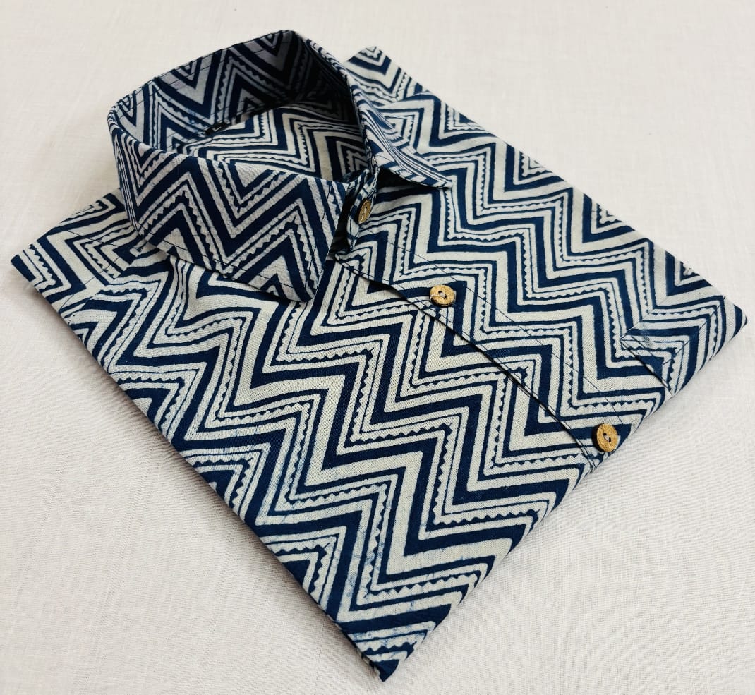 Experience the art of Bagru block printing with our exquisite Navy Zigzag Hand Block Printed Cotton Shirt for Men. Crafted from premium cotton 60*60 super dying fabric, this shirt features a bold zigzag pattern that adds a touch of artisanal charm to your wardrobe. The classic collar and wooden buttons enhance its traditional appeal. Embrace comfort and style with this handcrafted masterpiece. Explore more hand block printed apparel at Blockart.