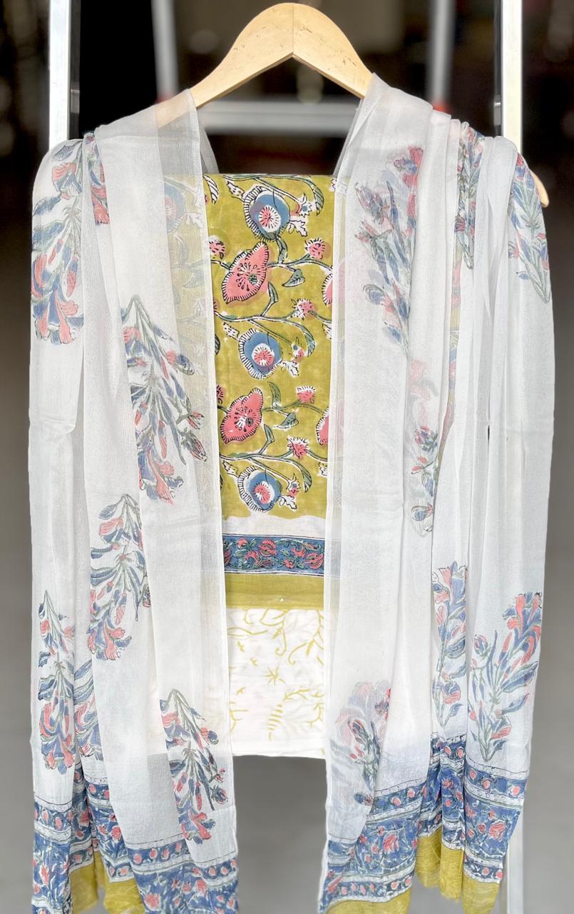 Celebrate the legacy of Indian textiles with this Olive Crimson Floral Cotton Dress Material, a perfect blend of tradition and contemporary elegance. Crafted from the softest cotton, this set features intricate hand block prints that add a touch of artisanal charm to your wardrobe. The breathable fabric ensures comfort throughout the day, making it suitable for both casual outings and special occasions.