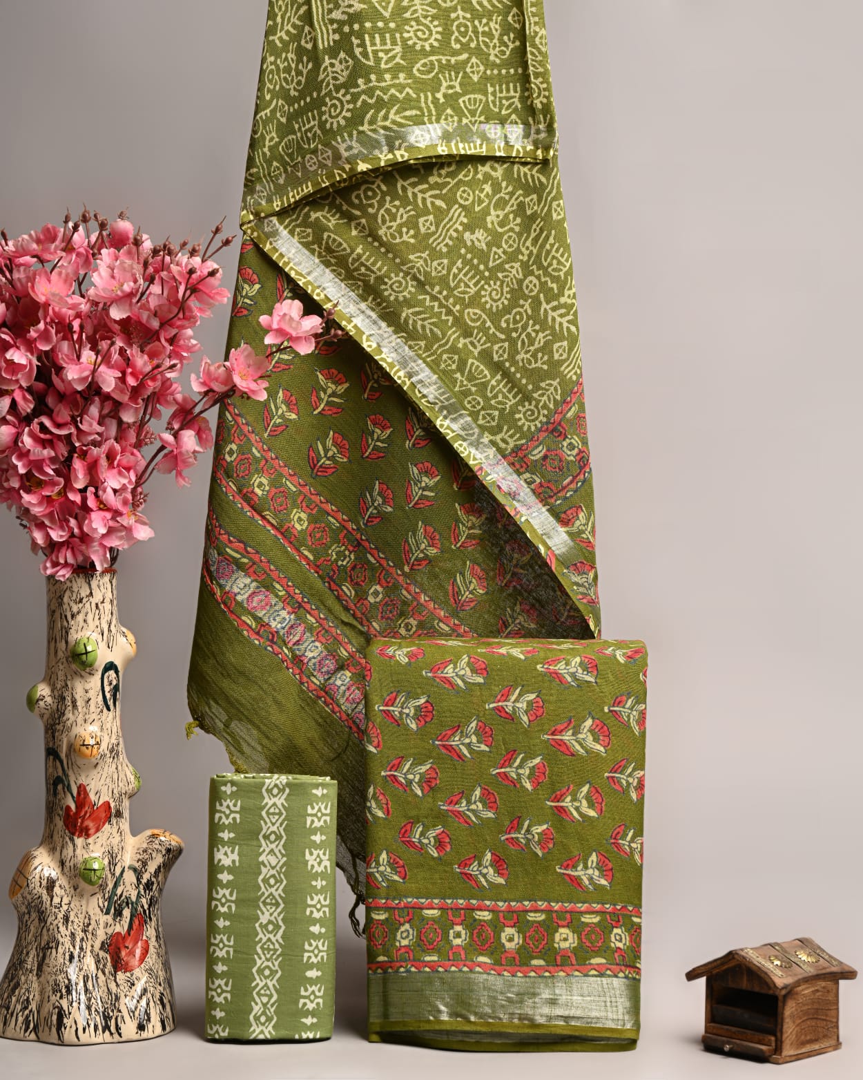 Indulge in the timeless elegance of hand block printing with this exquisite ethnic suit set from Blockart. Crafted from premium Linen Cotton fabric, each piece showcases intricate floral motifs in olive green, cream, and red hues. The top, dupatta, and bottom pieces offer a perfect blend of comfort and style, making it an ideal choice for special occasions and everyday wear.