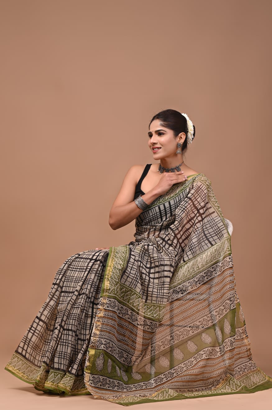 Infused with the spirit of Indian artistry, this olive green checkered Kota Doria saree boasts a striking interplay of black and white hues accented by elegant olive green edges and golden yellow borders. The intricate geometric motifs along the edges further enhance its charm, merging traditional craftsmanship with a modern aesthetic.