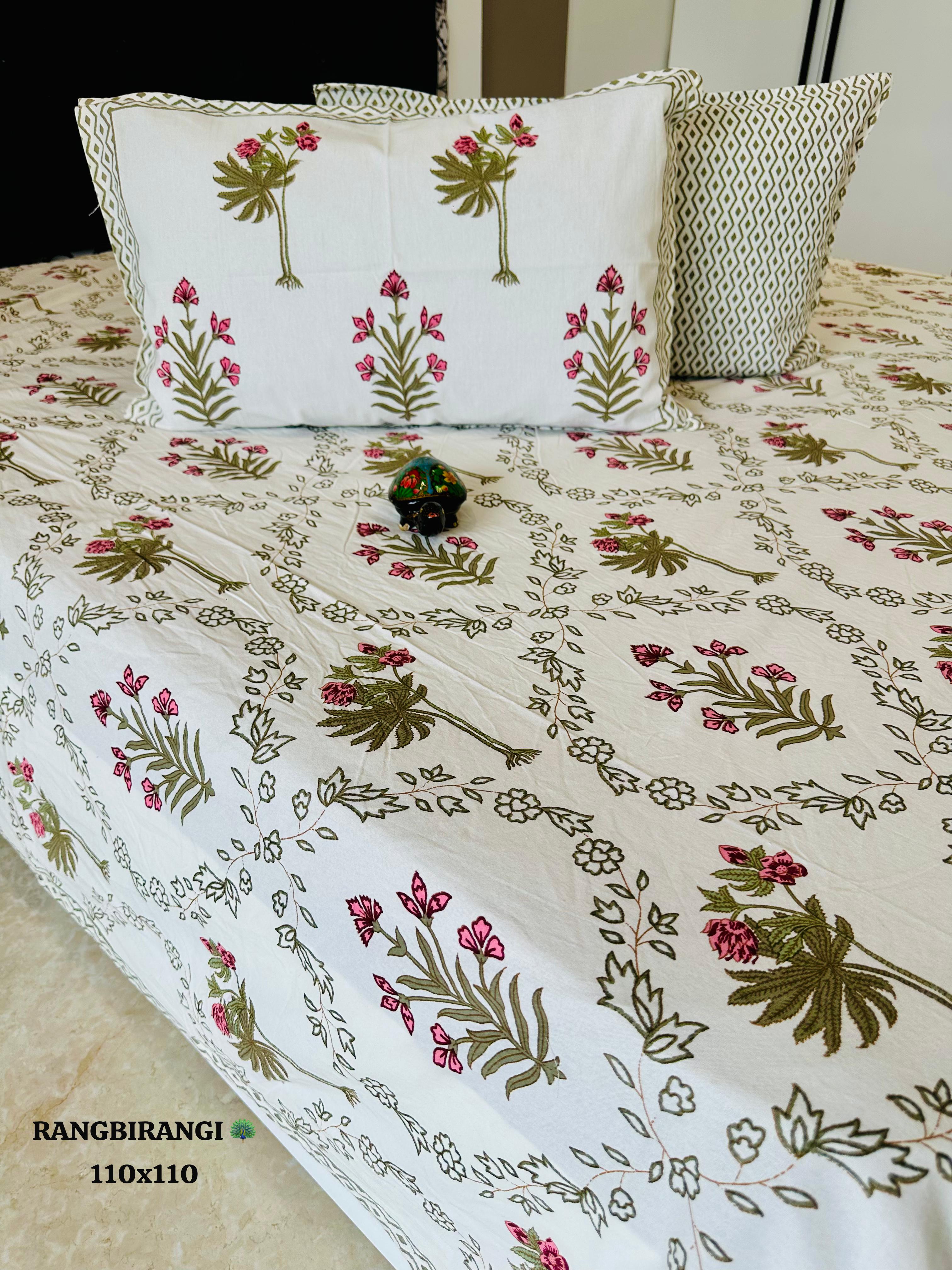 Indulge in the exquisite beauty of hand block prints and elevate your sleep experience with our Olive Green Floral Bliss Cotton Bedsheet Set.