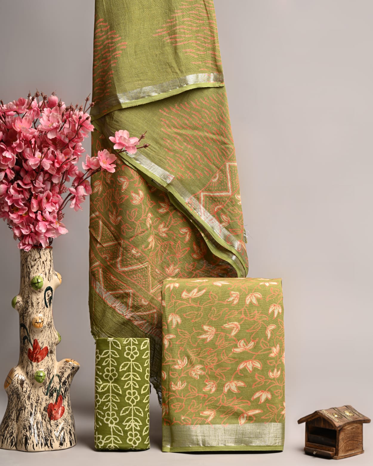 Indulge in the timeless elegance of this Olive Green Floral Linen-Cotton Saree Set with Silver Border from Blockart. Handcrafted with Bagru hand block printing, the set includes a Linen Cotton fabric top and dupatta, complemented by a Cotton fabric bottom. The intricate floral and leaf patterns in peach/coral hues exude a traditional charm, while the silver border adds a touch of sophistication. Experience the comfort and luxury of this artisanal creation that blends Indian craftsmanship with contemporary style.