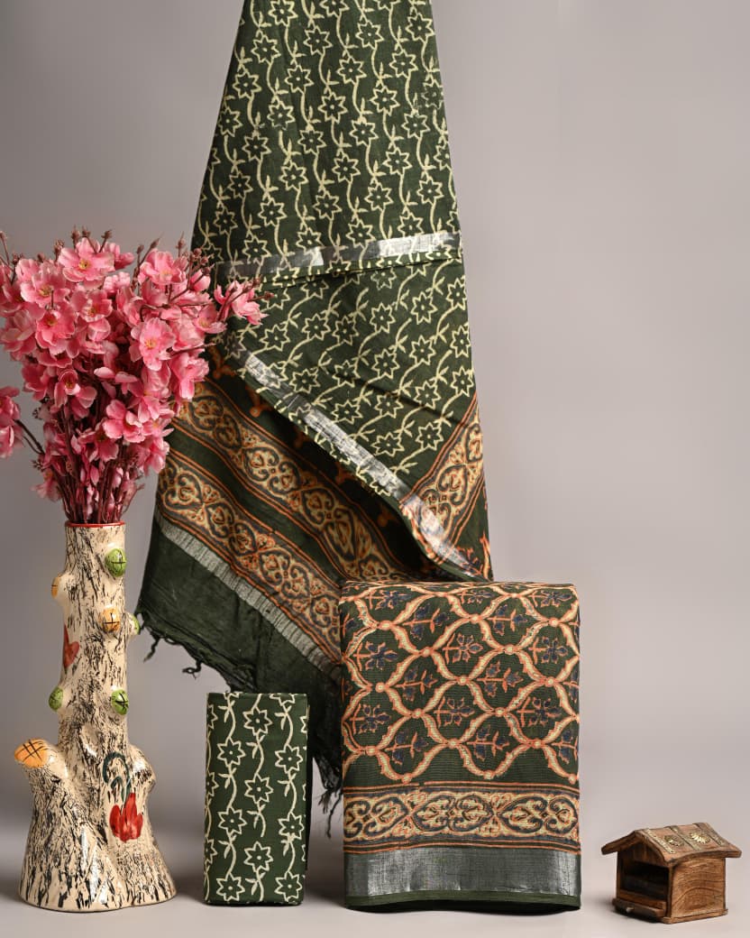 Indulge in the timeless elegance of Bagru Hand Block Printed Linen Suits with a touch of silver border. Crafted from premium Linen Cotton fabric, this set features intricate floral motifs in olive green, orange, and beige. The hand block printing adds an artisanal charm to the ensemble, making it a perfect blend of tradition and style.