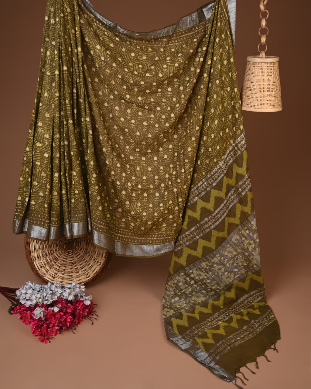 Wrapped in the gentle embrace of olive green, this saree showcases a harmonious blend of floral motifs and dynamic zig-zag patterns. Each element is meticulously crafted using traditional block printing techniques, resulting in a fabric that reflects both artistry and authenticity.