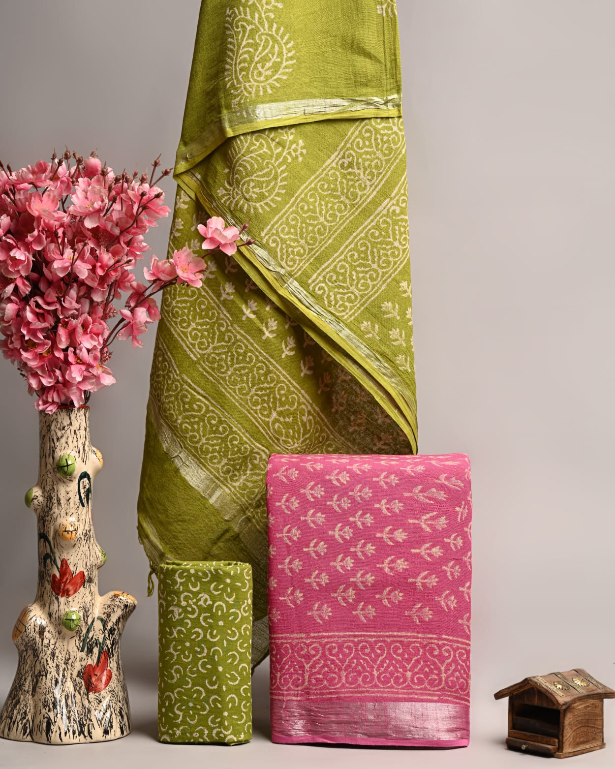 Elevate your ethnic wardrobe with these Bagru Hand Block Printed Linen Suits. Crafted from premium linen cotton fabric, the set includes a top with intricate olive green paisley designs, a dupatta featuring a silver border, and a comfortable cotton bottom. Hand block printed with traditional motifs, these suits offer a blend of artistry and comfort, perfect for any occasion. Embrace the elegance of traditional Indian craftsmanship with these meticulously designed pieces.