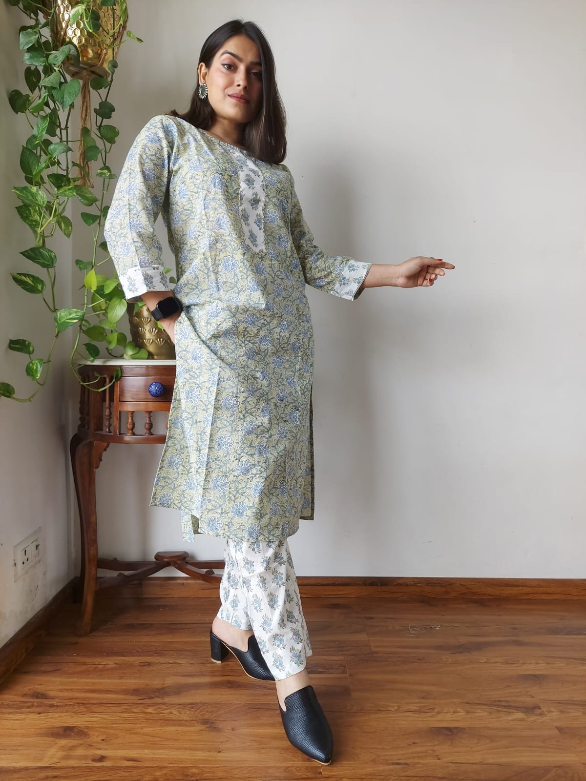 Imagine wearing this lovely set to a family get-together or a leisurely brunch with friends. The combination of soft hues and intricate designs brings a touch of artistry to your wardrobe.