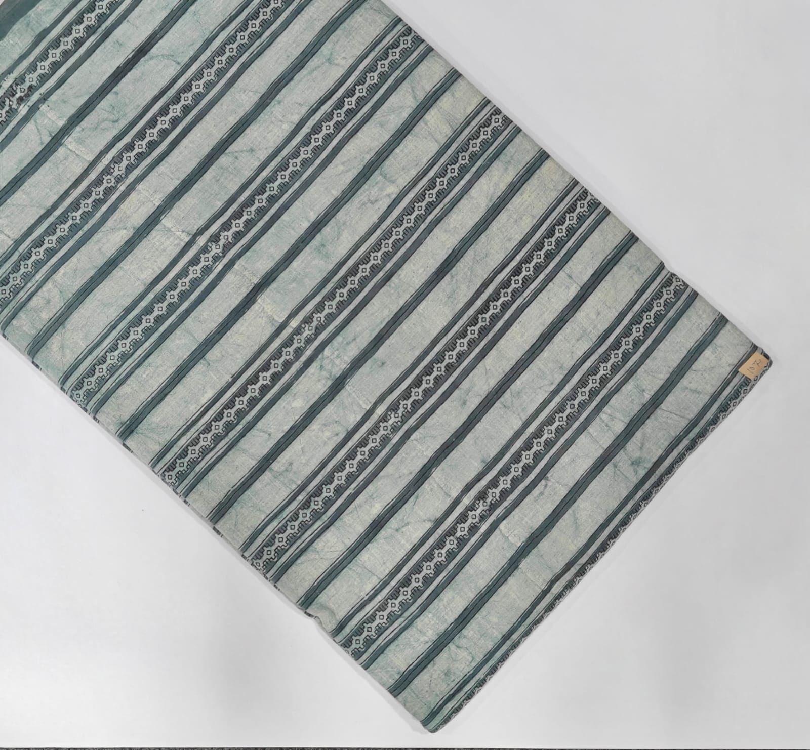 Envelop yourself in the soft embrace of our Pale Mint Lace Stripe Dabu Cotton Running Fabric. The gentle mint background whispers of tranquility, accentuated by elegant navy stripes adorned with intricate lace-like patterns. Each stripe is a testament to the meticulous artistry that defines traditional Bagru printing, where every detail is lovingly crafted to create a harmonious design that resonates with both modern and classic aesthetics.