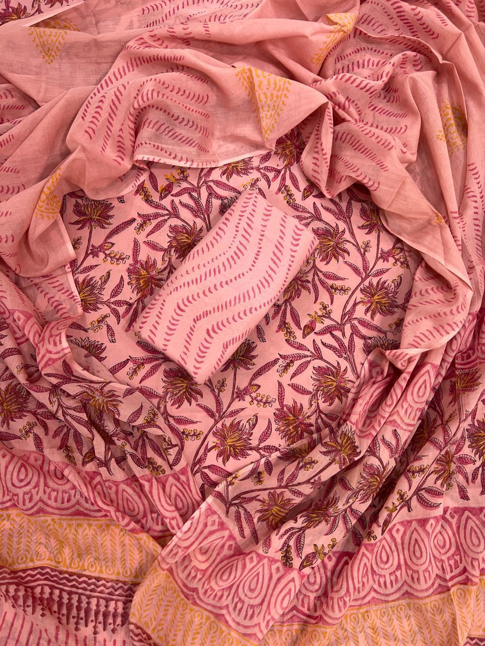 Rooted in the vibrant traditions of Indian artistry, this pastel blossom geometric cotton suit set is a beautiful representation of hand block printing. The delicate floral motifs dance among geometric shapes, showcasing a harmonious blend of heritage and contemporary flair. Each piece is artisan-crafted, reflecting the meticulous attention to detail that marks genuine craftsmanship.