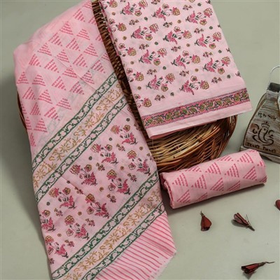Indulge in the artistry of hand block printing with this exquisite cotton dress material set. Crafted with precision, this set includes top, bottom, and dupatta fabrics, each 2.5 meters long. The top features a floral print with a decorative border, while the bottom fabric showcases a charming geometric pattern. The dupatta is adorned with floral and geometric motifs in soothing pastel hues. Elevate your ethnic wardrobe with this premium, artisanal creation.