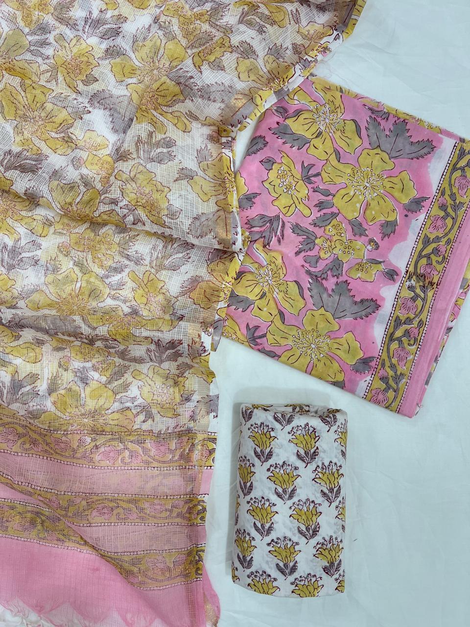 The vibrant colors, from deeper shades of yellow to whispers of lavender, come alive with the slight variations typical of hand block printing, offering a unique character that machine-made fabrics simply can’t replicate. Each edge is finished with intricate motifs, reflecting the meticulous care that goes into every piece.