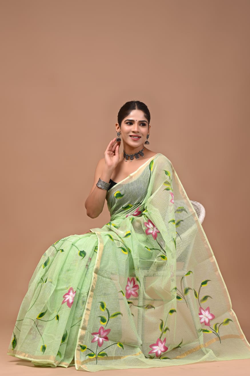Soft, pastel mint green sets the stage for a delicate dance of floral motifs, featuring shades of soft pink that resemble tender blush roses, accented by lively lime green hues for the leaves. This Kota Doria saree, artisan-crafted with meticulous attention to detail, embodies a refreshing aesthetic, perfect for warm weather.