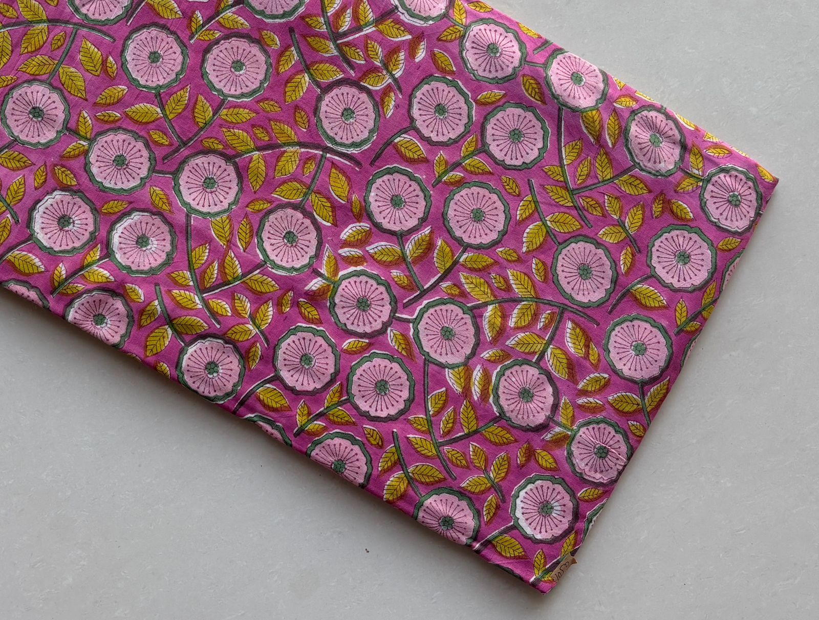 Immerse yourself in the artistry of our Pastel Pink Floral Artisan-Printed Cotton Fabric. This exquisite textile captures the essence of traditional craftsmanship, bringing together delicate floral patterns that flow seamlessly across a vibrant magenta backdrop. Each motif is a testament to skilled artisans who pour their heart into every block print.