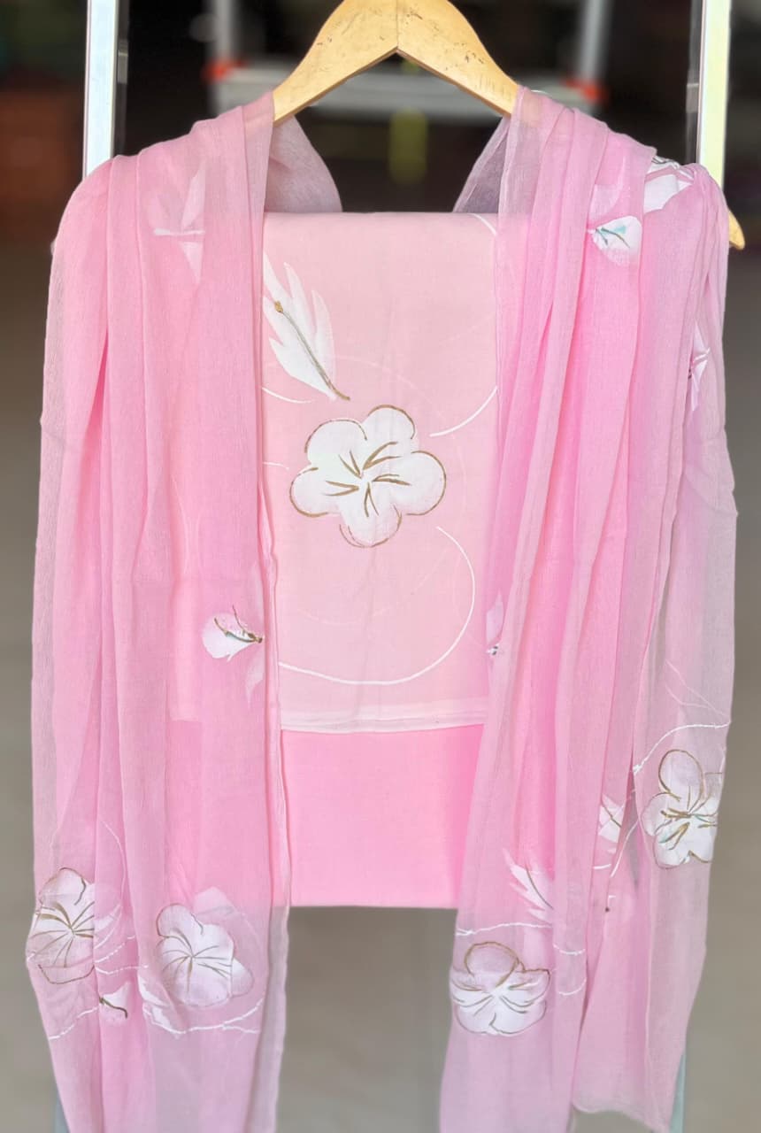 Immerse yourself in a gentle whisper of floral elegance with this enchanting cotton suit set. Crafted from 100% pure cotton, it promises superior comfort and breathability, making it a delightful choice for daily wear and special occasions alike.