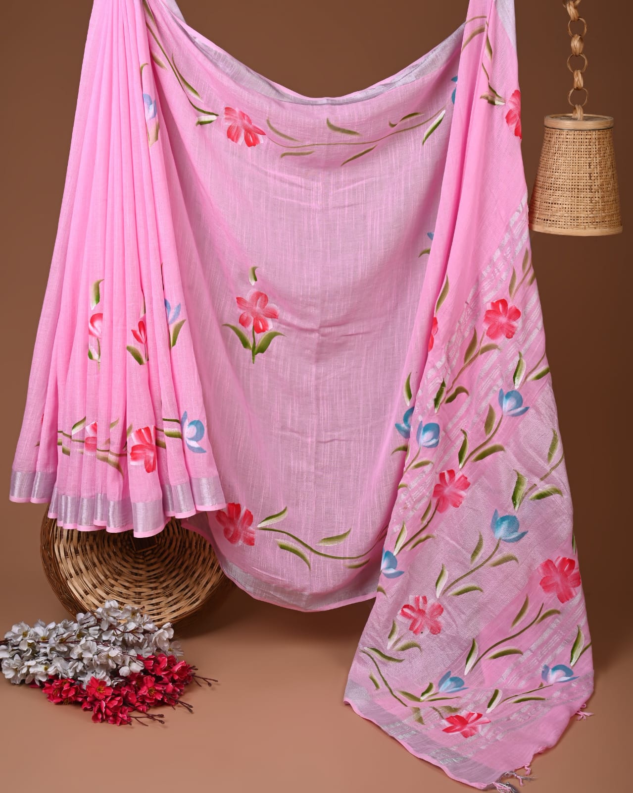 Steeped in heritage, this pastel pink saree brings the delicate artistry of hand block printing into the modern wardrobe. Each floral motif, lovingly painted by skilled artisans, showcases the intricate craftsmanship that has been passed down through generations. With its airy texture and gentle drape, this piece harmonizes traditional techniques with contemporary flair.