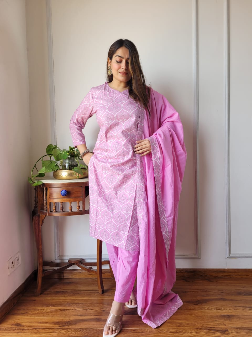 With each thread woven in artistry, the Pastel Pink Floral Dreams Cotton Suit Set invites you to experience the vibrant spirit of traditional craftsmanship. This ensemble is a charming blend of classic floral motifs that dance gracefully across a soft pastel backdrop, showcasing the beauty of hand block printing.