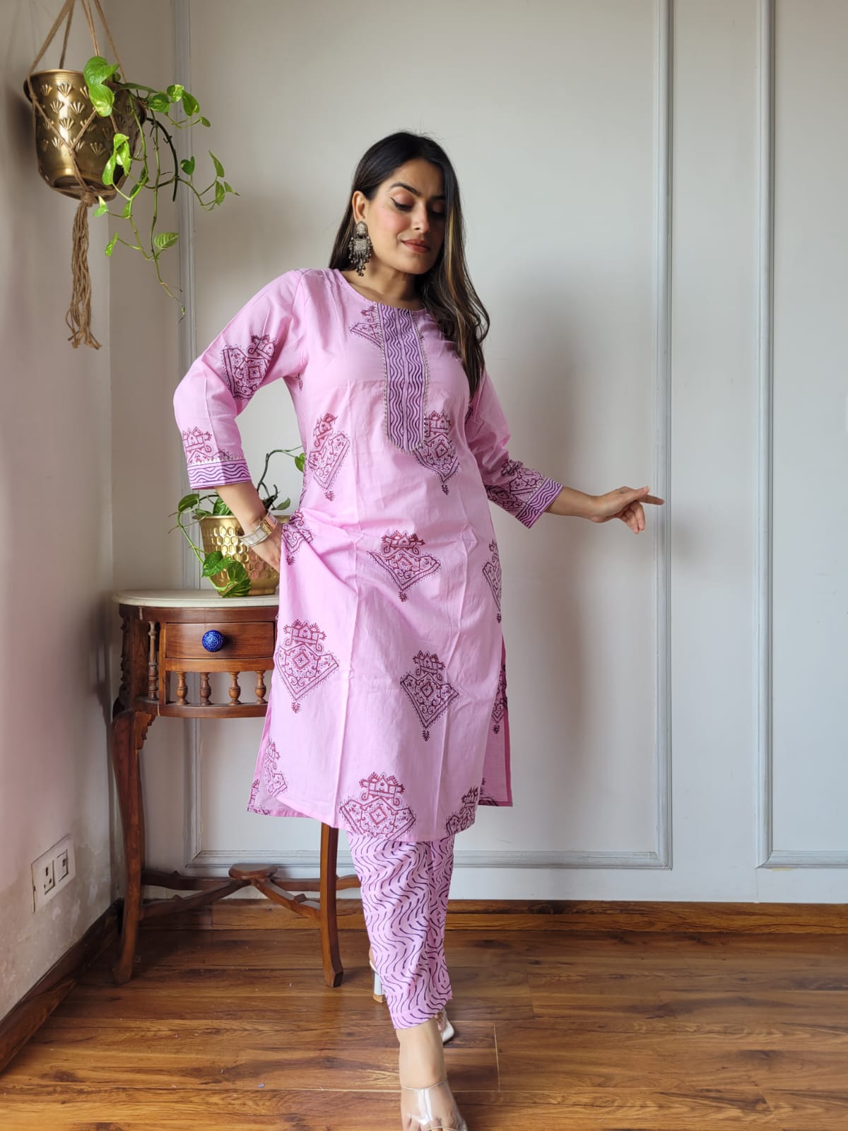 Step into a world of elegance with our Pastel Pink Floral Wave Cotton A-Line Set, expertly crafted to offer a chic blend of comfort and style. The soft cotton fabric drapes beautifully against your skin, making it a delight to wear throughout your day. The delicate floral embroidery in deep maroon adds a touch of sophistication, while the zigzag-patterned leggings introduce a playful energy to your ensemble.