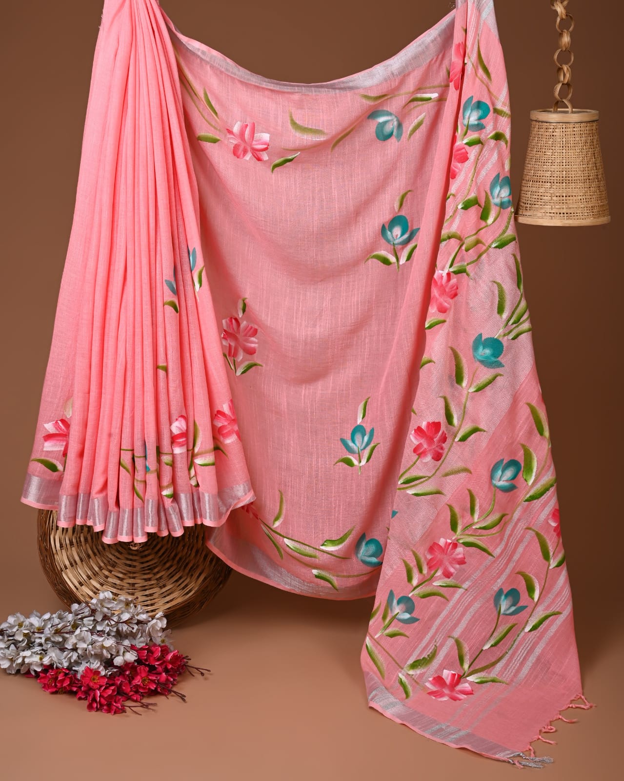 Immerse yourself in the rich tapestry of Indian craftsmanship with our Pastel Pink Floral Whimsy Hand Block Printed Linen Saree. This enchanting piece features a soft pink base adorned with vivid crimson flowers and lively lime green leaves, bringing a touch of nature's beauty into your wardrobe. Each floral motif is meticulously hand-printed, showcasing the artistry that Blockart is proud to represent.
