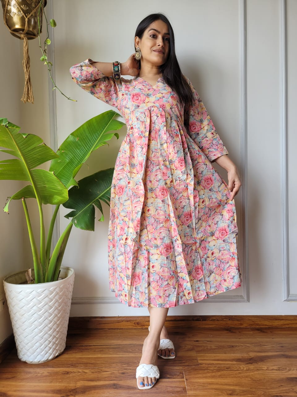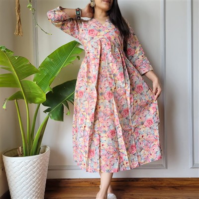 Embrace the artistry of hand block printing with our Peach Blossom Bagru Hand Printed Cotton Dress. Crafted from breathable Cotton 60*60 Super Dying fabric, this dress features a V-neckline, three-quarter sleeves, and flattering pleats below the bust for a flowy silhouette. The Aliya pattern adds a touch of traditional charm, making it ideal for casual or semi-casual occasions. Elevate your wardrobe with this artisanal piece.