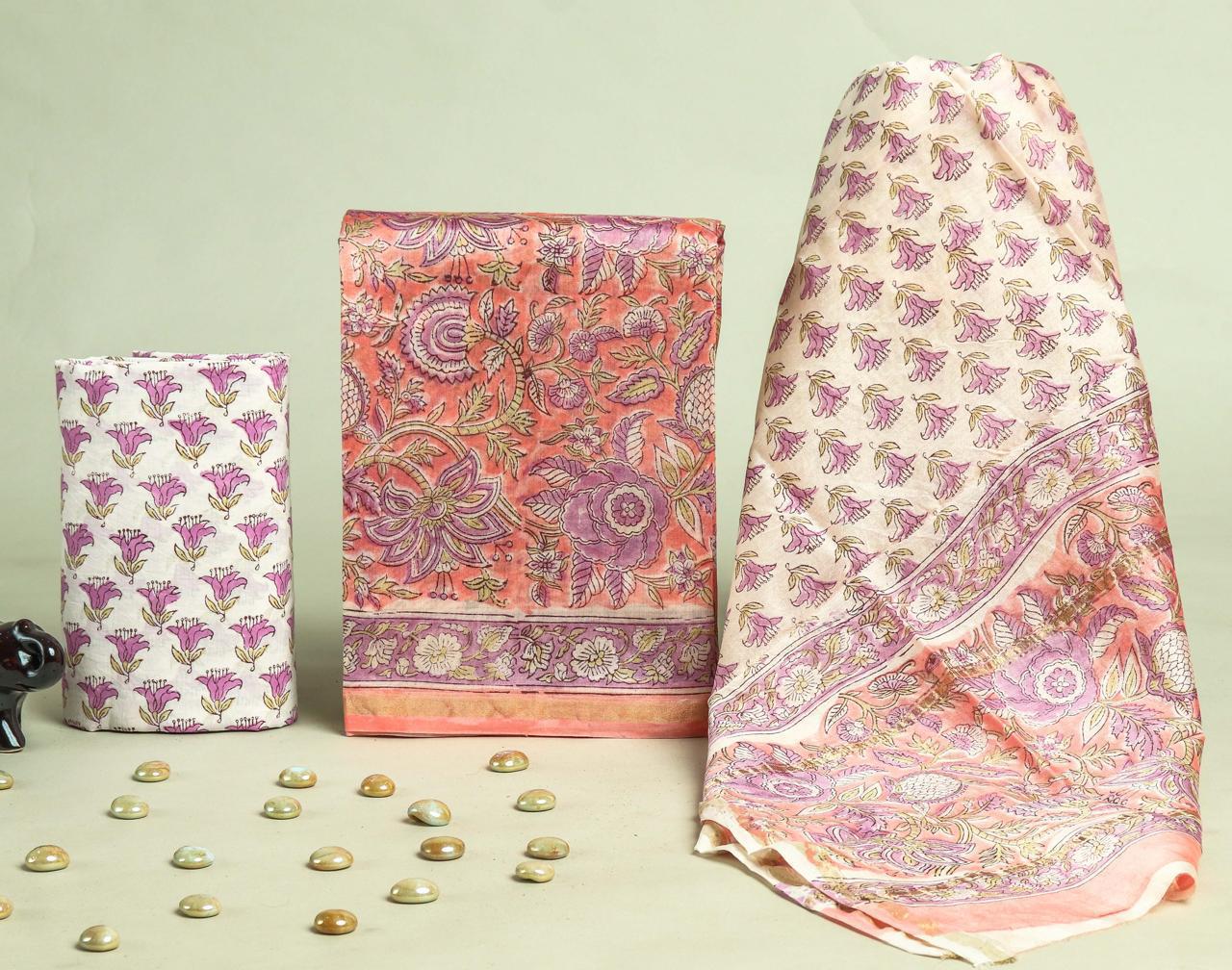 Indulge in the exquisite art of hand block printing with this premium Chanderi silk dress set from Blockart. Crafted with precision, the set includes a top and dupatta in soft Chanderi silk, adorned with intricate floral motifs. The cotton bottom adds comfort and versatility, making it perfect for ethnic occasions. Embrace the elegance of traditional Indian craftsmanship with this artisanal ensemble.