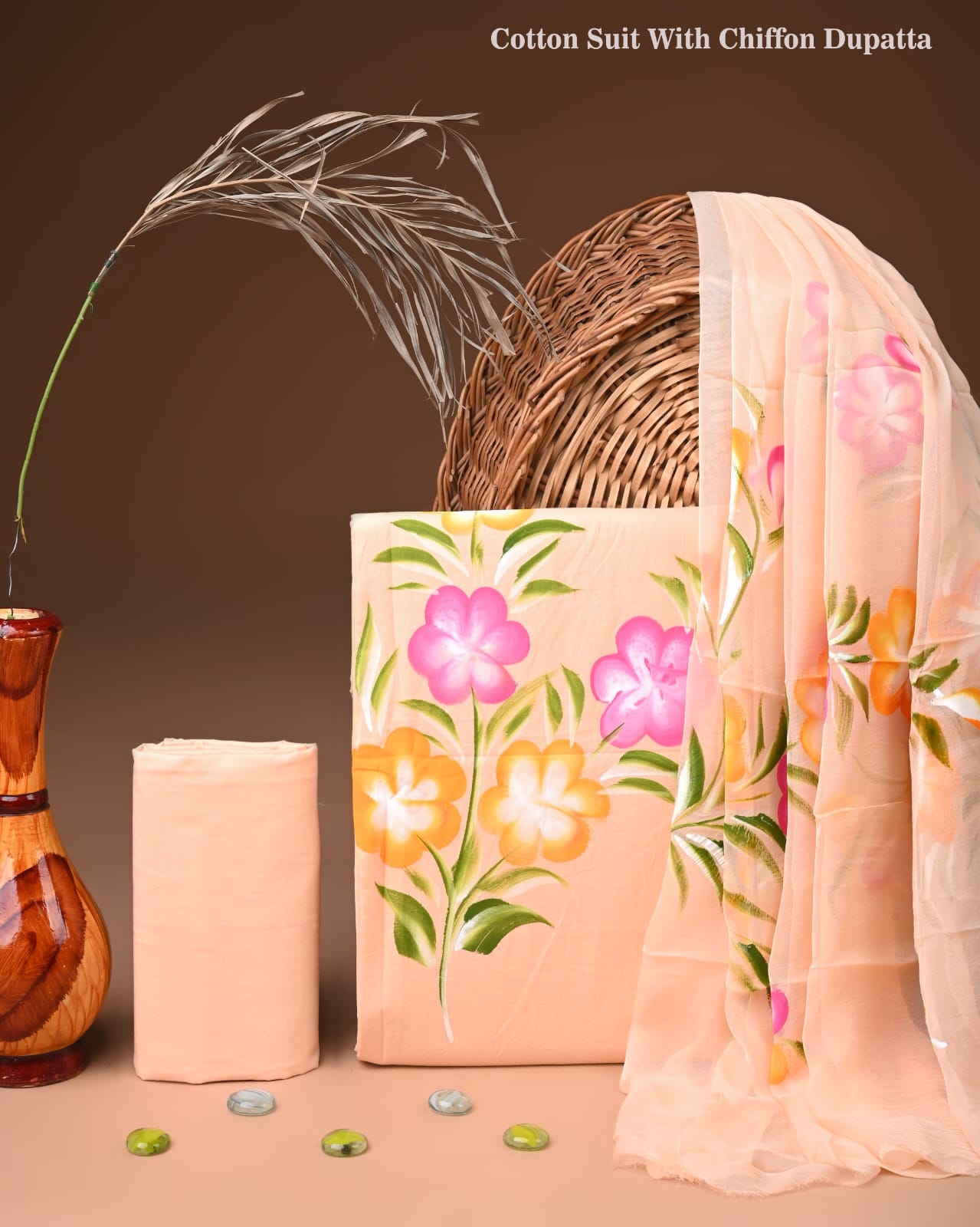 Crafted to embrace you in comfort, the breathable cotton fabric gracefully molds to your silhouette while the airy chiffon dupatta flows effortlessly with every step. Ideal for everything from festive gatherings to casual outings, this ensemble offers versatility without compromising on style.