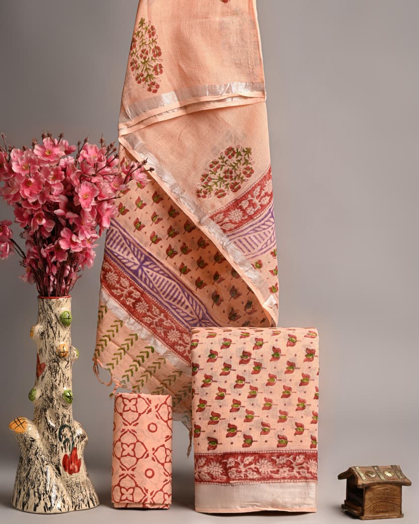 Peach Blossom Hand Block Linen Cotton Suit Set