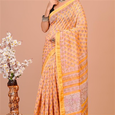 Each inch of this saree is a testament to the art of hand block printing, a traditional technique that adds a unique touch to every motif. The intricate floral patterns in shades of pink, purple, and green symbolize the vibrancy of Indian culture, while the contrasting yellow-orange border and pallu enhance the saree visual appeal.