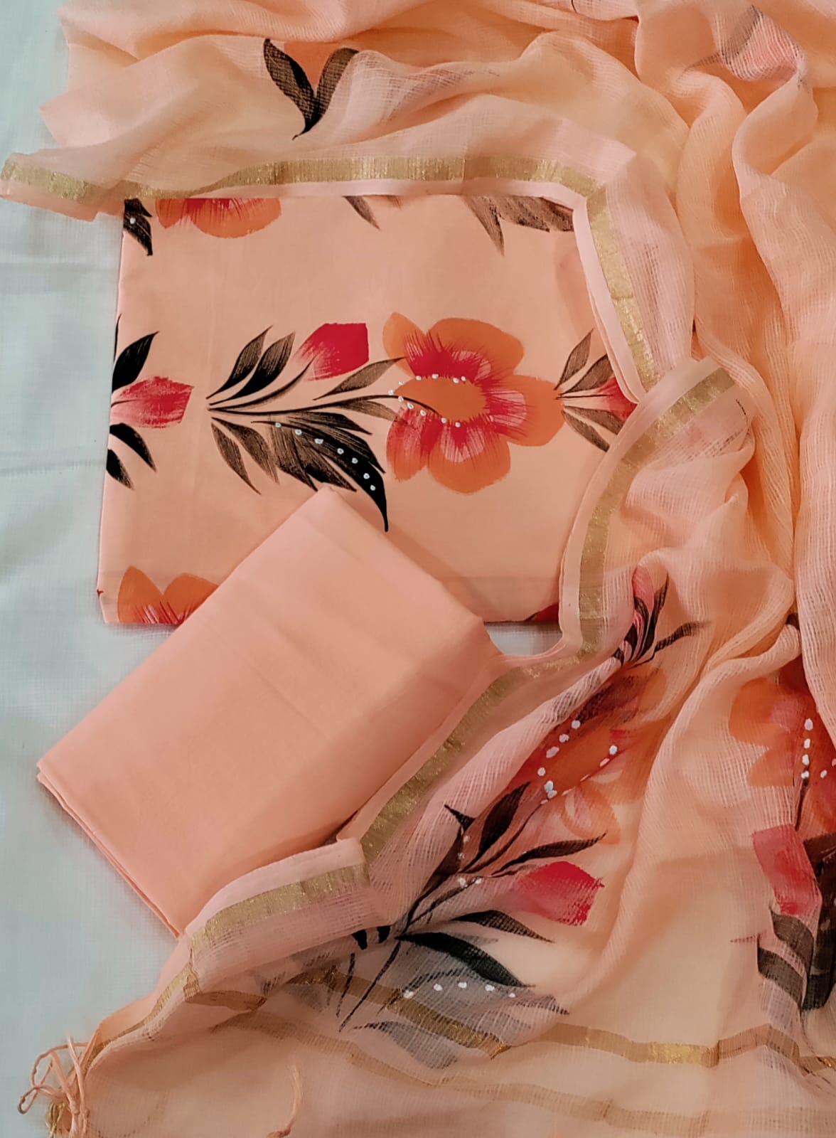 Peach Floral Hand Block Printed Cotton Suit with Kota Doria Dupatta