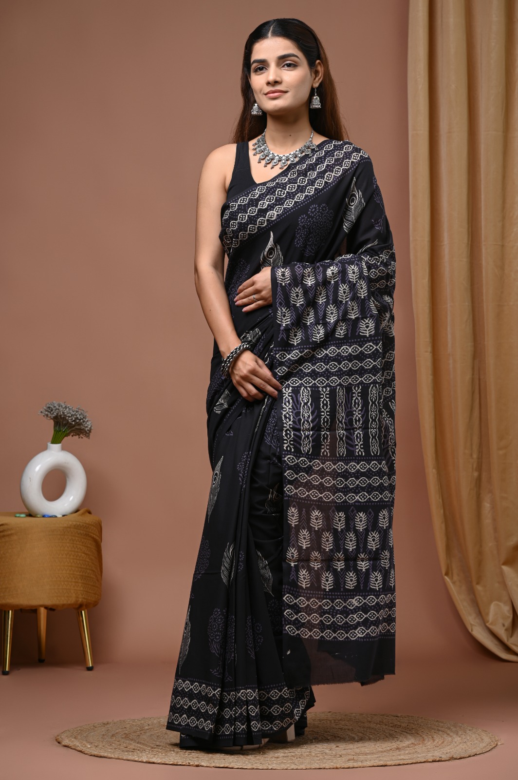 Peacock Feather Black Block Printed Mulmul Cotton Saree