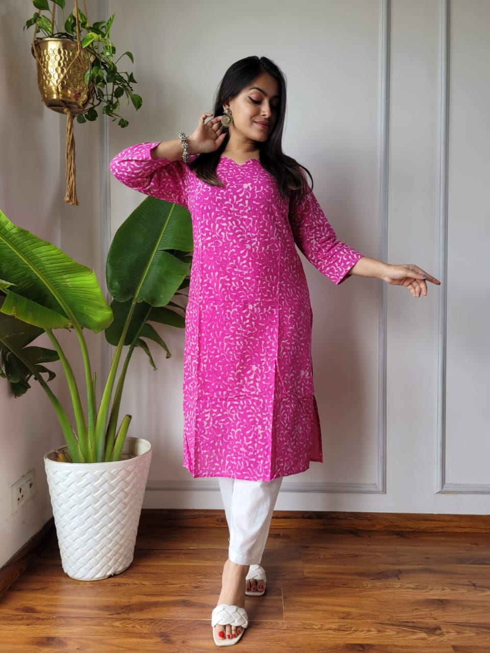 Embrace the uniqueness of this pink abstract blossom cotton ensemble with white pants. The intricate hand block print creates a one-of-a-kind pattern that stands out elegantly. The vibrant pink color with a white abstract design exudes a playful yet sophisticated vibe. Crafted with artisan techniques, this ensemble offers a blend of tradition and modern style. The practical benefits include a comfortable fit and versatile styling options for various occasions. Feel a deep emotional connection to the craftsmanship behind this exquisite outfit, and step into a world of timeless charm.