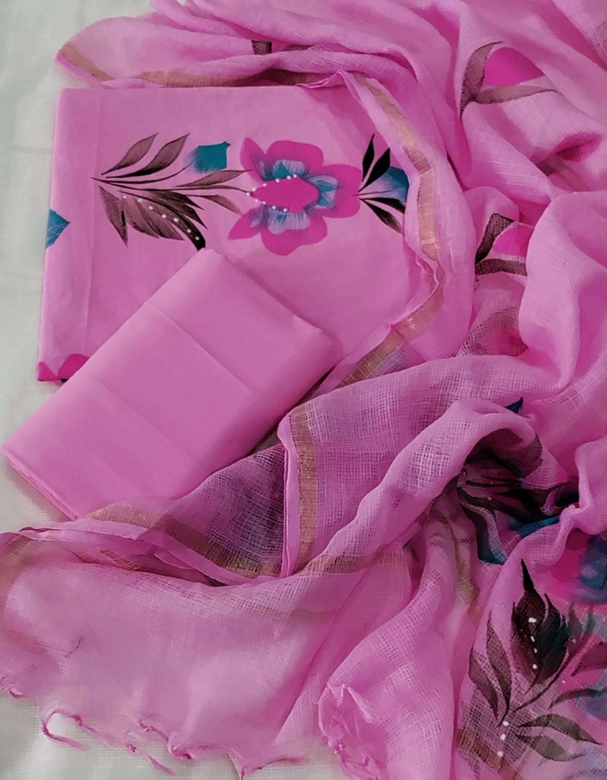 Experience the charm of traditional Indian craftsmanship with this exquisite hand block printed cotton suit set. The soft and breathable cotton fabric ensures comfort while the intricate floral designs showcase the skilled artistry of hand block printing. The set includes a top, bottom, and Kota Doria dupatta, offering a complete ethnic ensemble perfect for various occasions.