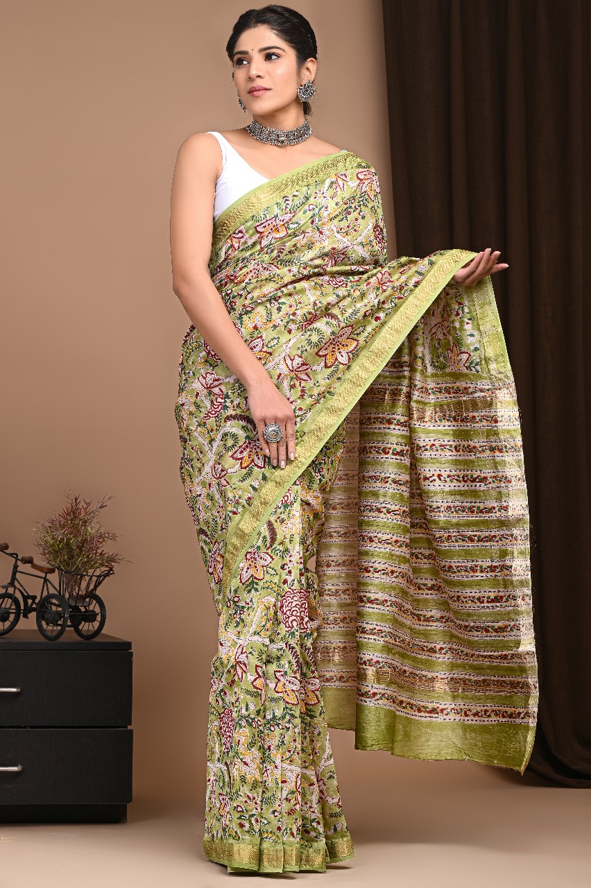 Pistachio Green Hand Block Print Maheshwari Silk Saree