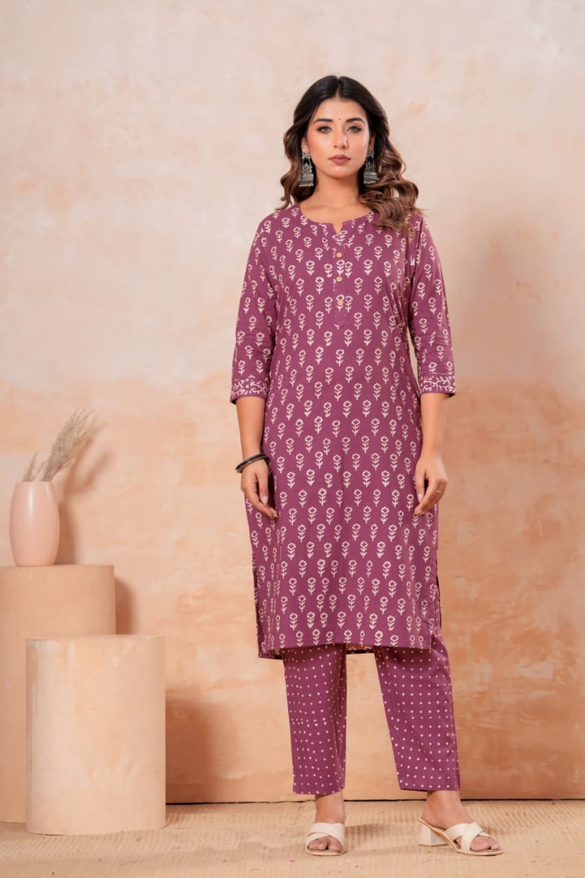 In the soft embrace of deep plum, this striking kurti set brings together the timeless charm of floral artistry and a playful polka dot accompaniment. Each delicate flower, hand block printed with precision, dances gracefully across the fabric, inviting warmth and joy into your wardrobe.