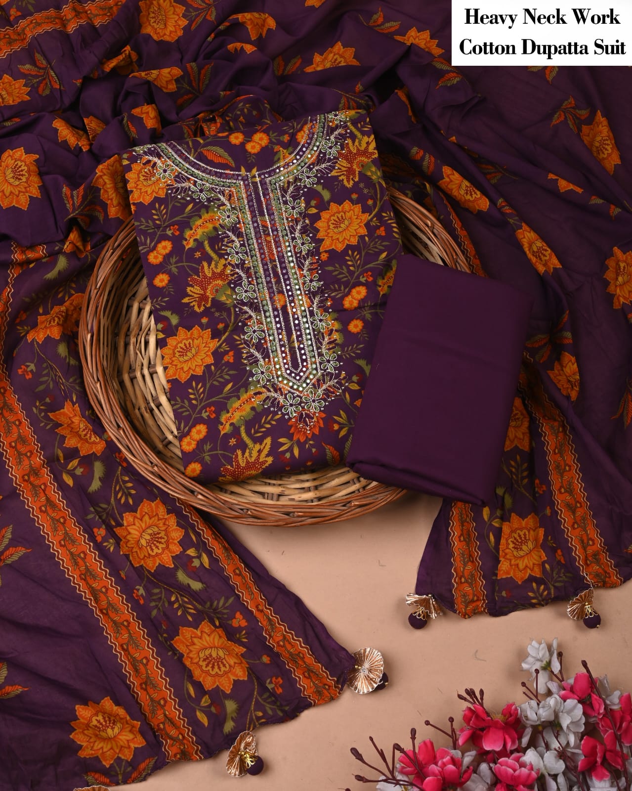 Immerse yourself in the rich tapestry of Indian craftsmanship with this Plum Floral Gota Work Unstitched Suit Set. The deep plum background serves as a canvas for vibrant orange and golden yellow floral motifs, artfully arranged to reflect the beauty of nature. Each piece is artisan-crafted with attention to detail, featuring a stunning embroidered neckline and elegant gota patti work that adds a touch of sophistication.