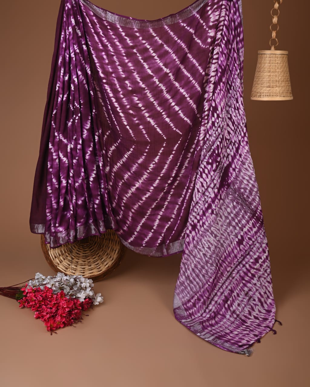 The captivating tie-dye pattern showcases rich plum and soft lavender hues, intricately tied and dyed to create a unique, flowing visual experience. Each saree is a testament to the meticulous process of artisan craftsmanship, where no two pieces are ever alike. The elegant patterns and gentle sheen make this saree not just a garment, but a work of art.