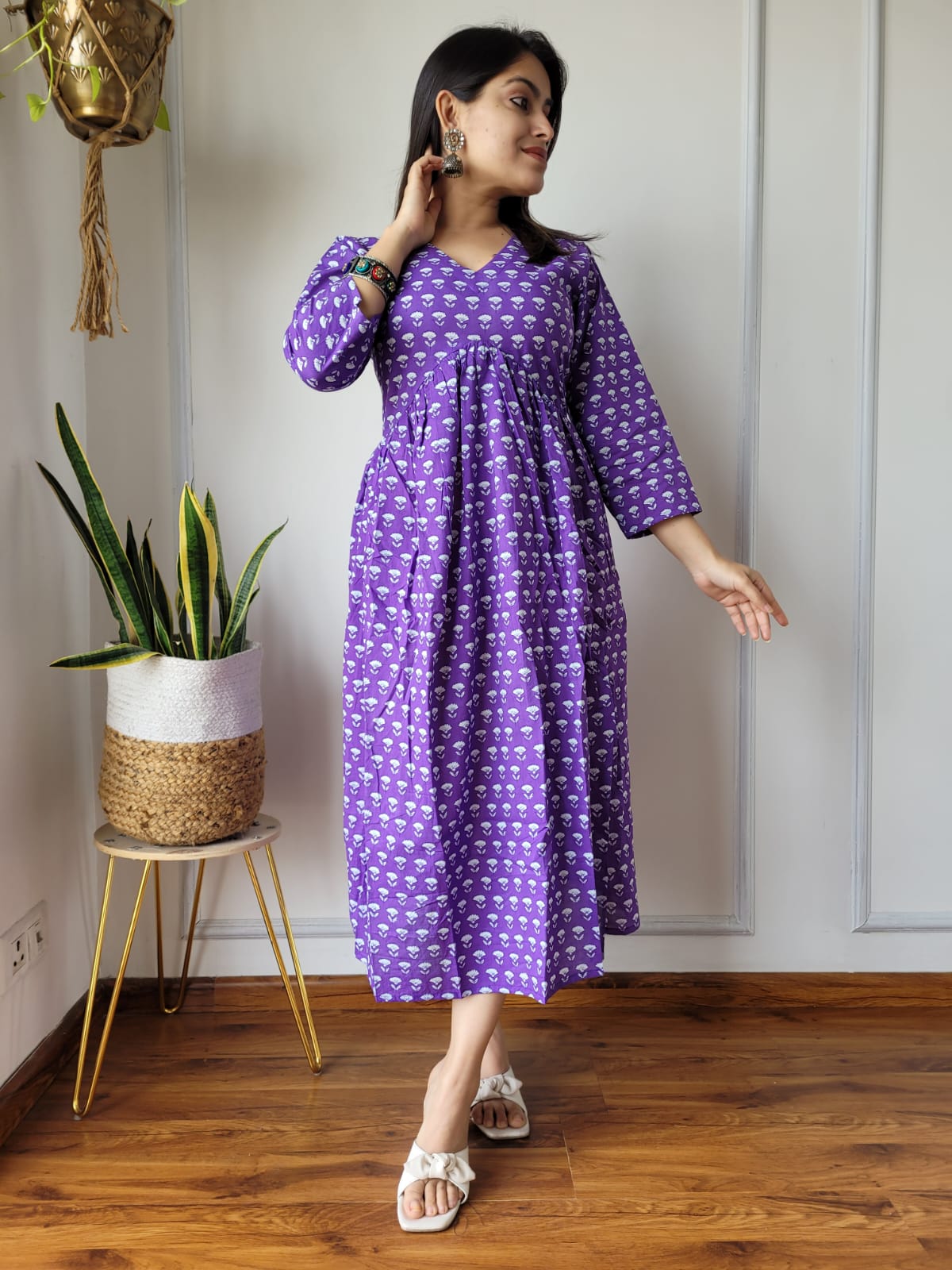 Indulge in the traditional artistry of Bagru block printing with this exquisite Purple Bagru Block Printed Cotton Frock Dress. Crafted from premium Cotton 60*60 Super Dying fabric, this dress features a V-neckline, three-quarter sleeves, and a gathered waistline creating a flowy silhouette. The intricate Aliya frill adds a touch of elegance. Perfect for casual or semi-casual occasions, this dress exudes comfort and style.