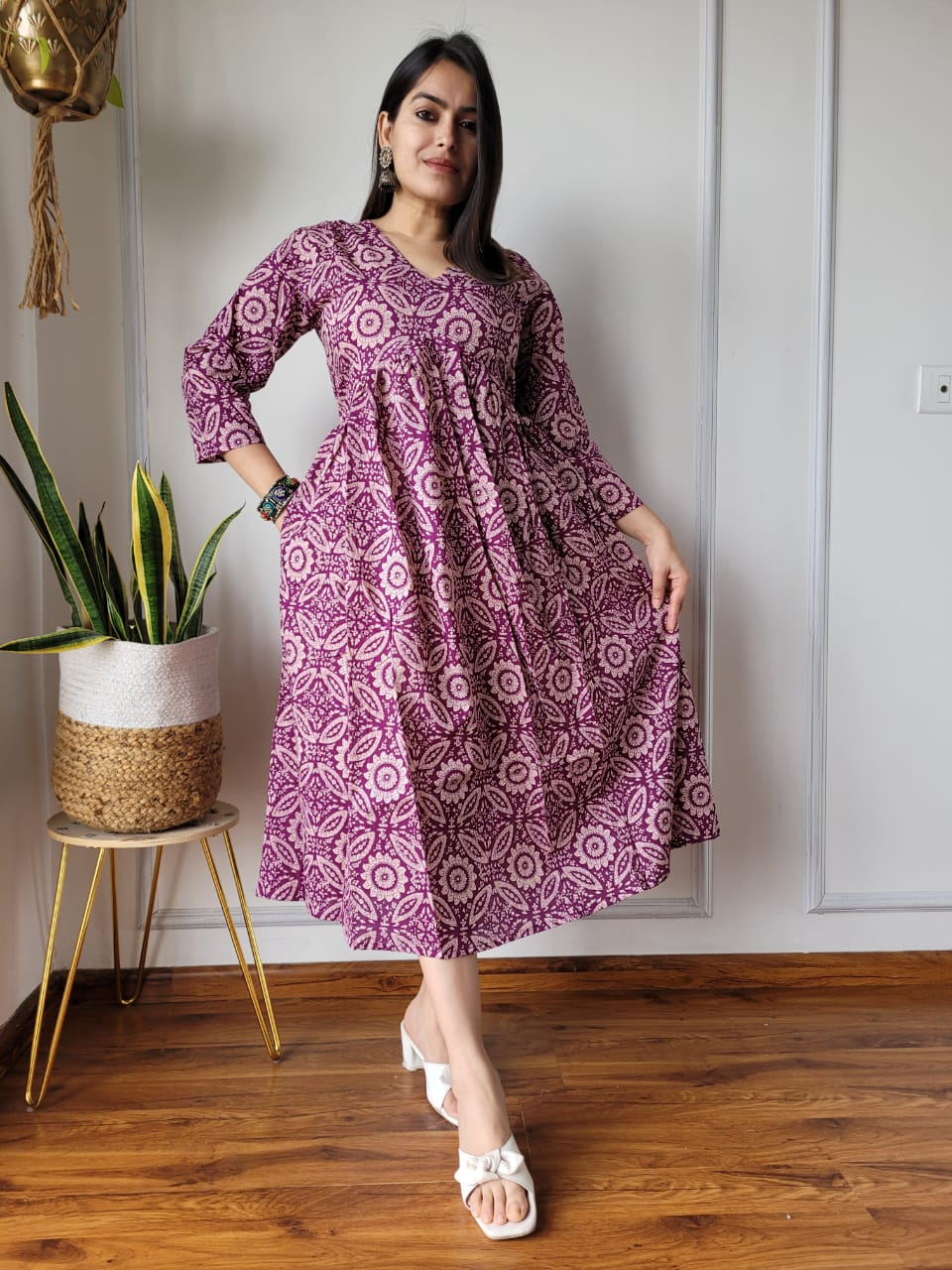 Purple Blossom Bagru Hand Printed Cotton Dress Aliya Frill Design