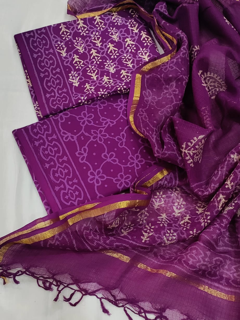 Purple Floral Hand Block Printed Cotton Suit with Kota Doria Dupatta