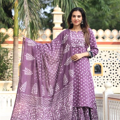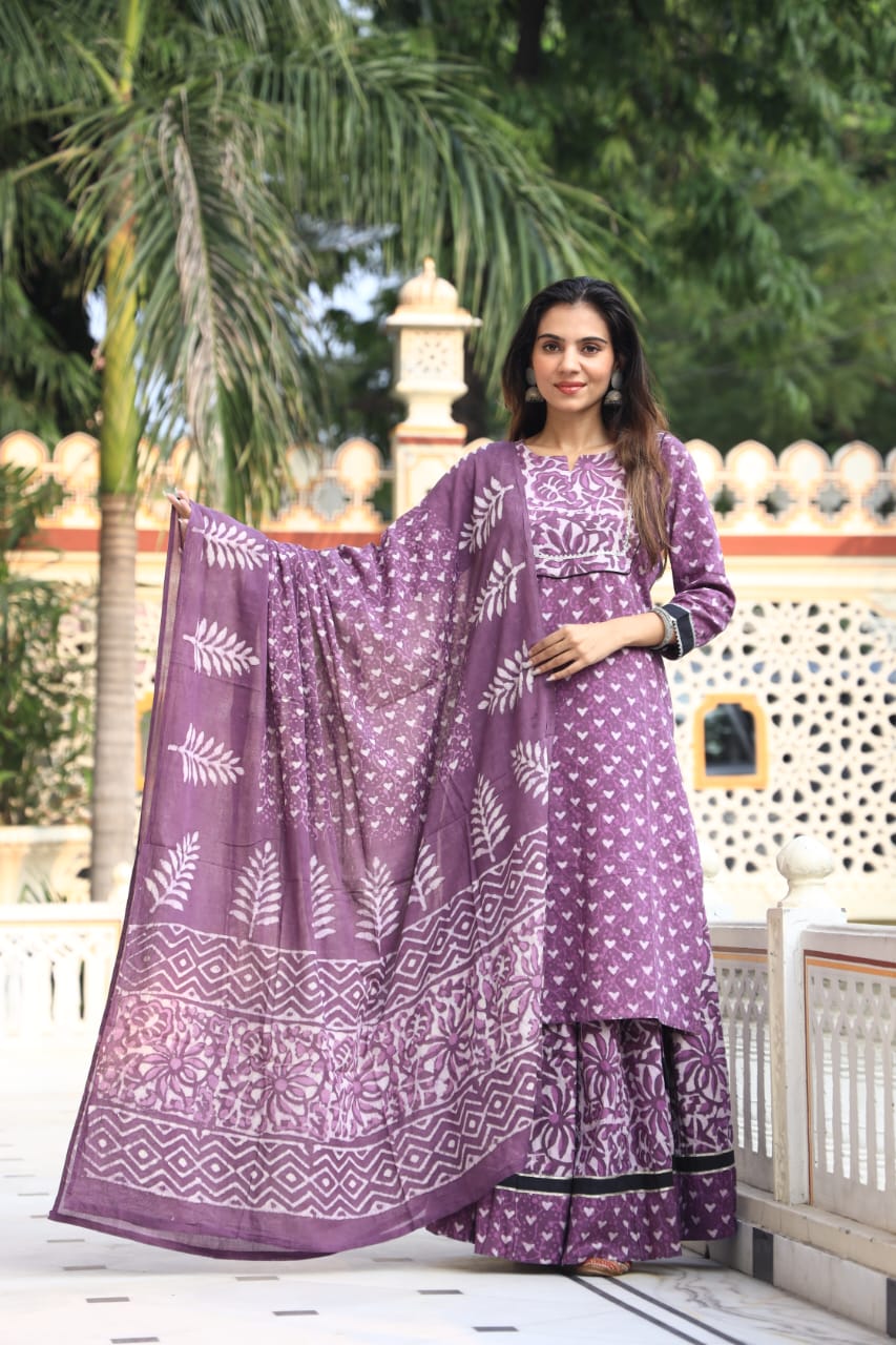 Indulge in the artistry of hand block printing with this exquisite Purple Floral Heart Printed Cotton Kurta Set with Dupatta. Crafted from lightweight and breathable cotton, this set features a round neckline, three-quarter sleeves with contrasting borders, and intricate floral designs. Elevate your ethnic wardrobe with this premium ensemble perfect for festive occasions or casual gatherings.