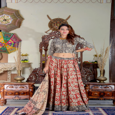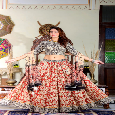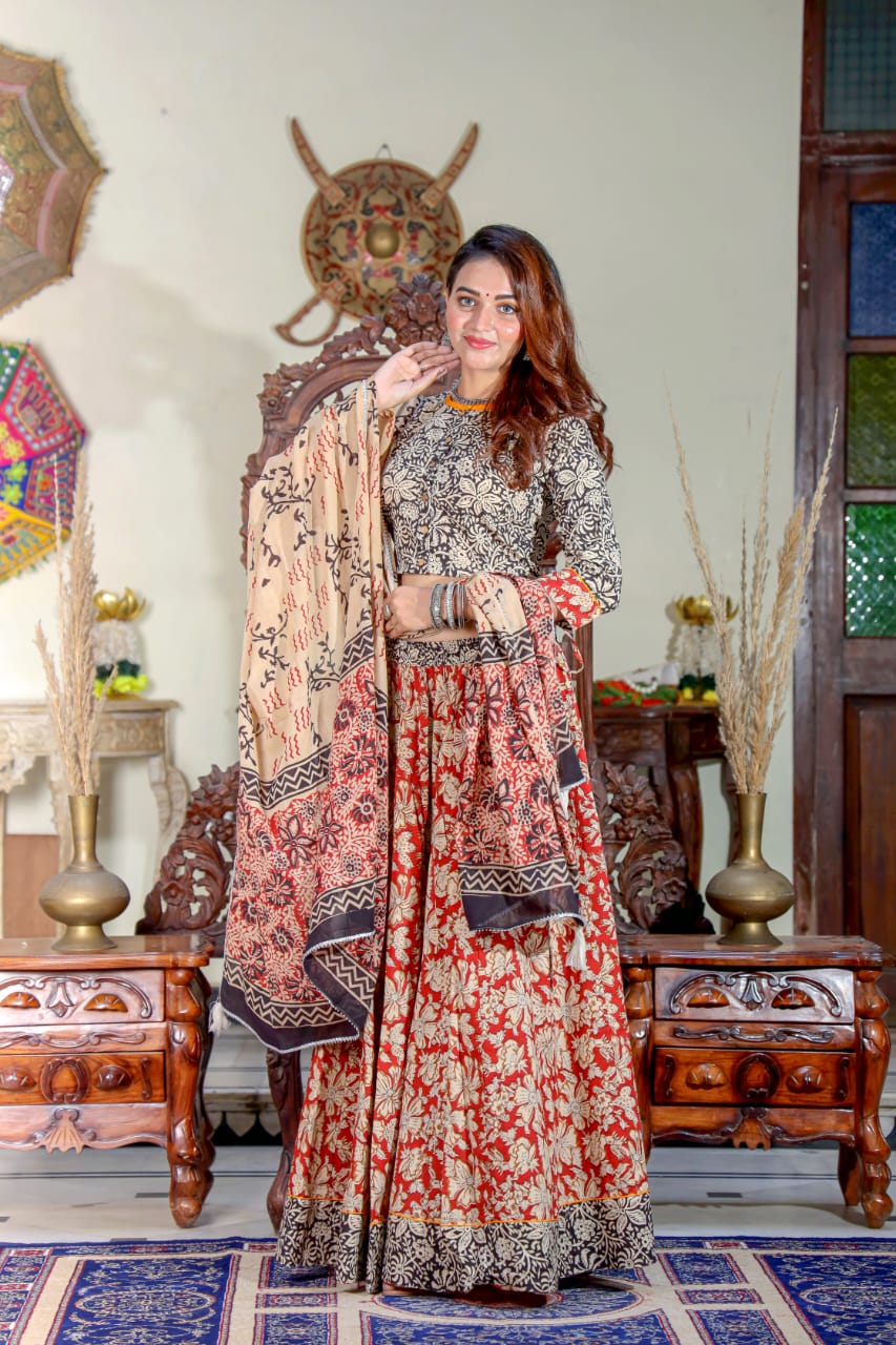 This vibrant lehenga set showcases the beauty of traditional handblock prints in an eye-catching palette of red and beige. The blouse features intricate black floral patterns on a beige base, giving it a sophisticated look. This red lehenga is adorned with cream coloured floral motifs, creating a beautiful contrast. The dupatta ties the entire ensemble together with a beige background and artistic block prints in red and black, accentuated by bold border detailing. Made from soft cotton fabric, this outfit ensures both elegance and comfort, making it perfect for festivities, weddings or cultural gatherings. The combination of earthy colours and fine artistry makes this lehenga an evergreen outfit for any traditional wear.