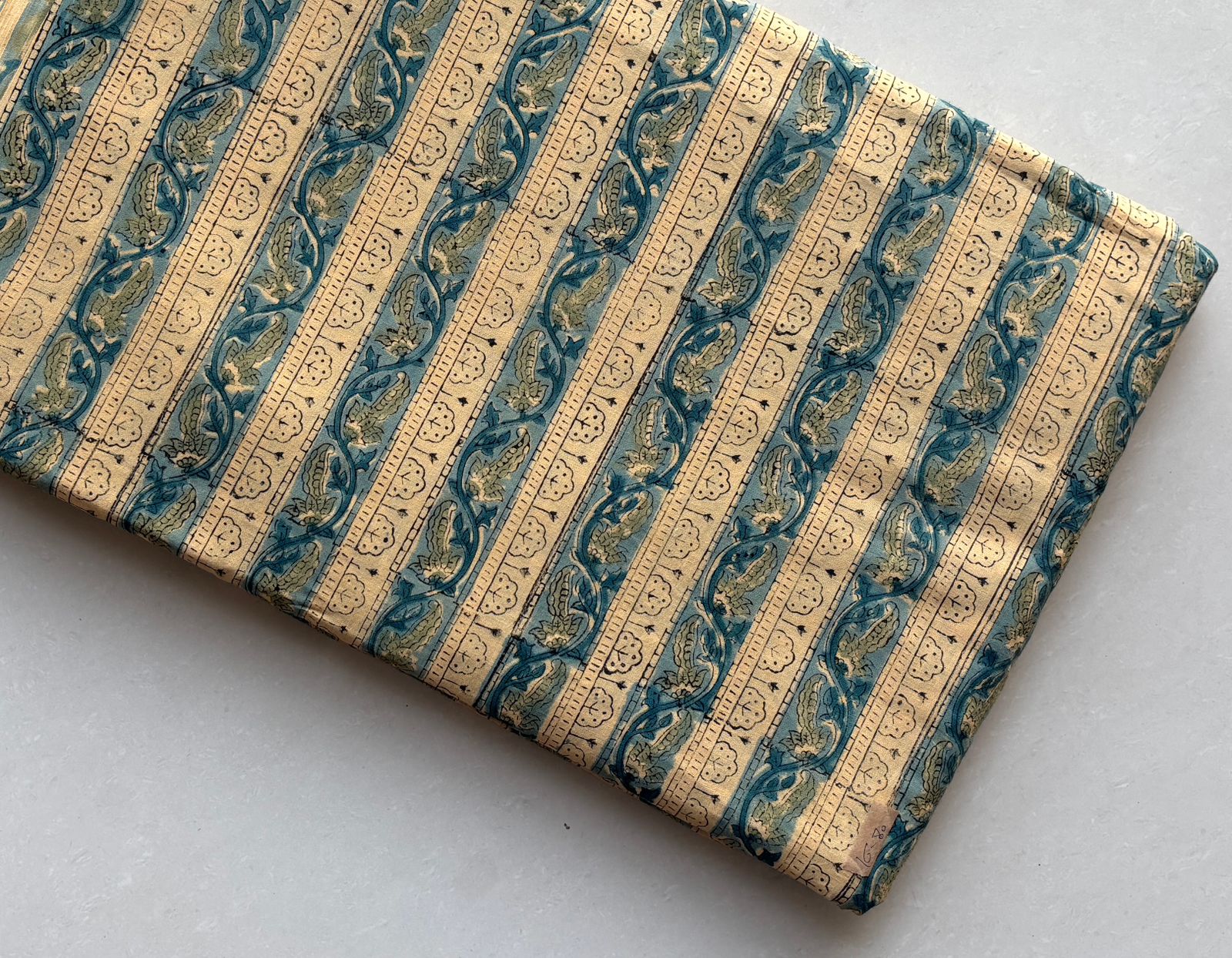 Immerse yourself in a world of exquisite craftsmanship with our Regal Gold Teal Blooms Cotton Running Fabric. This stunning textile brings together centuries of Indian artistry, where elegant floral motifs dance gracefully against a sumptuous gold backdrop.