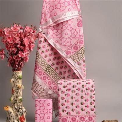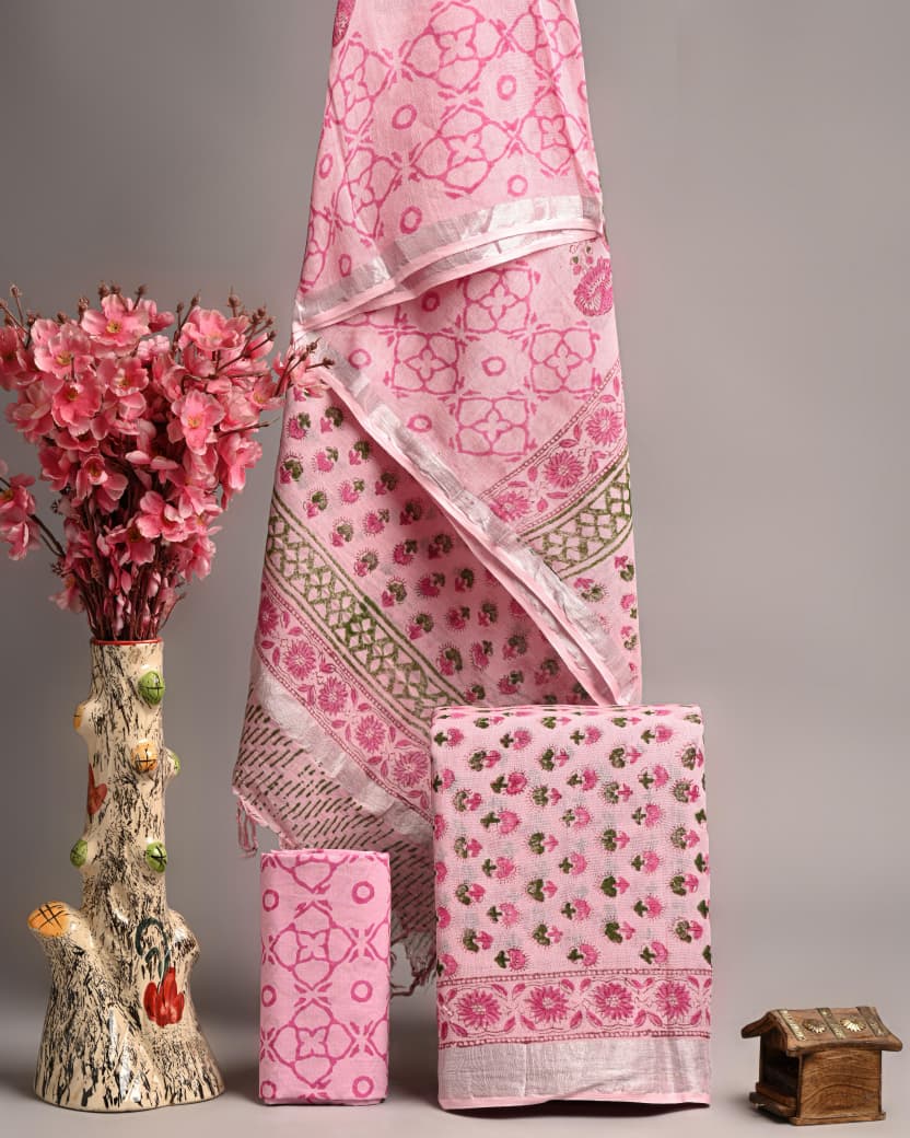 Indulge in the timeless elegance of Bagru Hand Block Printed Linen Cotton Suit Set from Blockart. This artisanal ensemble features intricate hand block prints on high-quality Linen Cotton fabric, offering both style and comfort. The set includes a top, dupatta, and bottom, each showcasing a harmonious blend of floral and geometric patterns. Elevate your ethnic wardrobe with this premium, handcrafted creation that reflects the rich heritage of Indian craftsmanship.