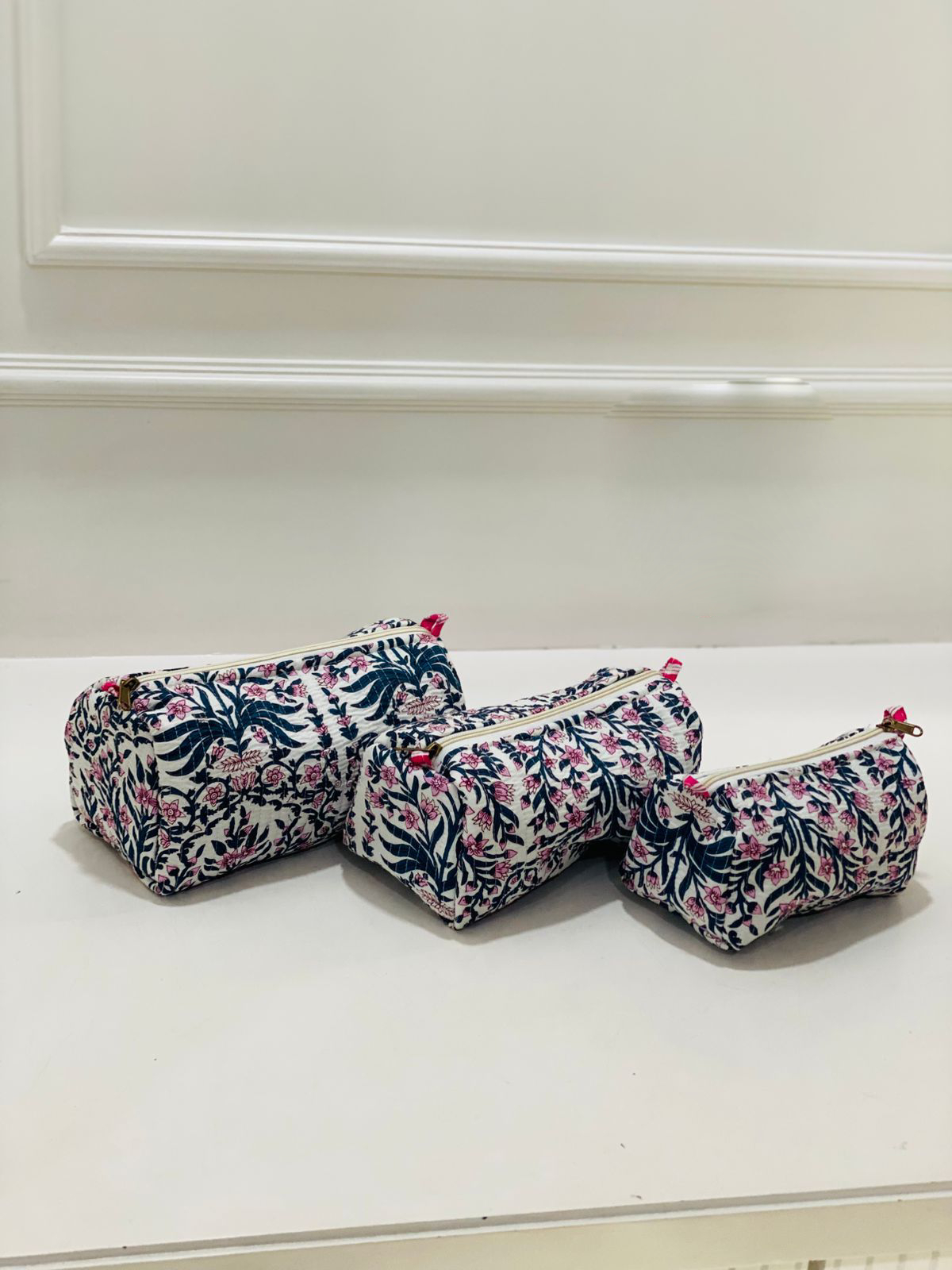 Explore the rich tapestry of Indian textile heritage with our Rose Petal Floral Quilted Toiletries Pouch Set. Inspired by traditional floral motifs, each pouch tells a story of artistry, blending vibrant colors with intricate designs. Crafted from heavy quilted fabric, these pouches are tailored to withstand the rigors of everyday life while showcasing a touch of elegance.