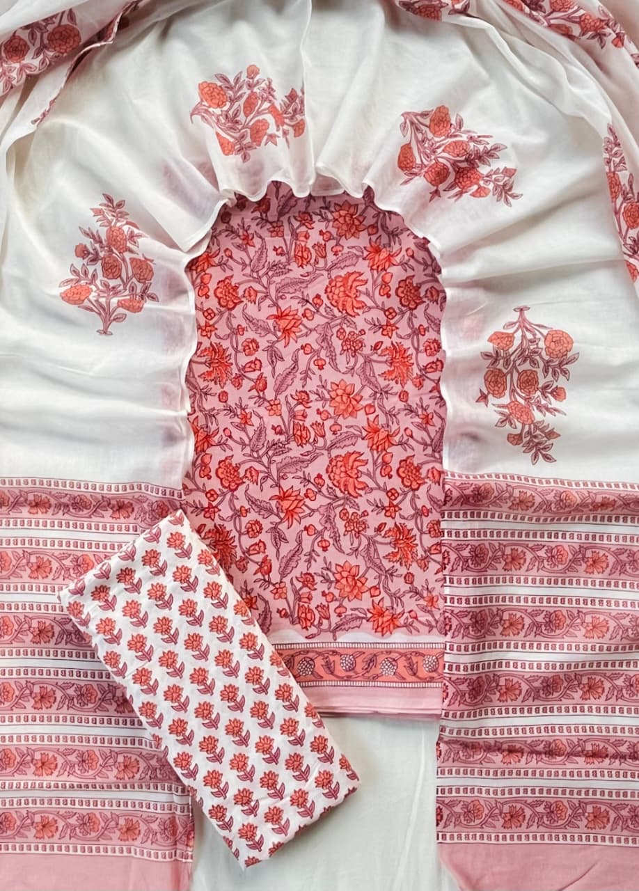 Indulge in the timeless elegance of hand block printing with this exquisite Rose Pink Floral Cotton Suit Set with Matching Dupatta by Blockart. Crafted from premium cotton fabric, this set features a dense floral pattern in shades of red and orange on a soft pink background, exuding traditional charm. The set includes a 2.5-meter cotton top and bottom fabric, along with a matching dupatta, all designed for your comfort and style. Elevate your ethnic wardrobe with this artisanal creation.