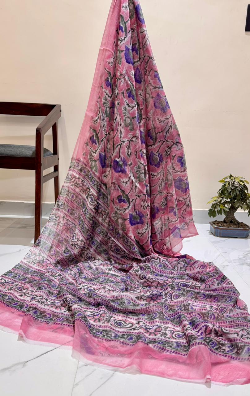 Indulge in the elegance of hand block printing with our Rose Pink Floral Double Diamond Chiffon Saree. Crafted from pure double diamond chiffon with bemberg silk, this saree features intricate floral patterns in purple, green, and black. The delicate fabric and detailed paisley motifs add a touch of grace to your ethnic wardrobe. Embrace the artistry and comfort of traditional Indian craftsmanship.