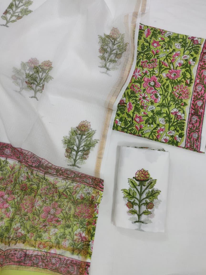 When you long for a touch of nature in your wardrobe, this exquisite fabric set offers a delightful solution. Adorned with vivid rose pink florals and lush green leaves, it’s a celebration of artistry that invites you to express your unique style. The delicate block prints whisper stories of skilled artisans, while the rich magenta border adds a pop of vibrancy, creating an enchanting visual appeal.
