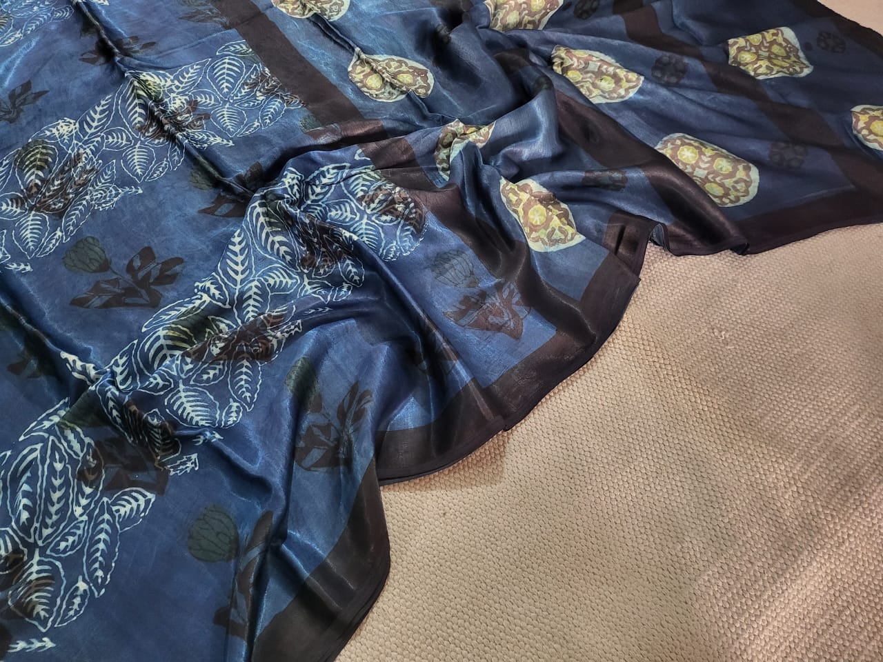 Royal Blue Floral Elegance Silk Saree with Earthy Tones